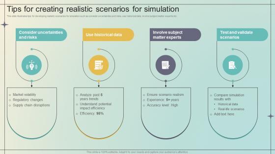 This slide illustrates tips for developing realistic scenarios for simulation such as consider uncertainties and risks, use historical data, involve subject matter experts etc. Retrieve professionally designed Immersive Training For Practical Tips For Creating Realistic Scenarios For Simulation DTE SS V to effectively convey your message and captivate your listeners. Save time by selecting pre-made slideshows that are appropriate for various topics, from business to educational purposes. These themes come in many different styles, from creative to corporate, and all of them are easily adjustable and can be edited quickly. Access them as PowerPoint templates or as Google Slides themes. You do not have to go on a hunt for the perfect presentation because Slidegeeks got you covered from everywhere. This slide illustrates tips for developing realistic scenarios for simulation such as consider uncertainties and risks, use historical data, involve subject matter experts etc.