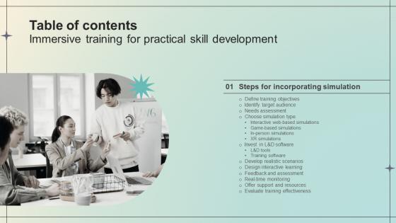 Boost your pitch with our creative Table Of Contents For Immersive Training For Practical Skill Development DTE SS V. Deliver an awe-inspiring pitch that will mesmerize everyone. Using these presentation templates you will surely catch everyones attention. You can browse the ppts collection on our website. We have researchers who are experts at creating the right content for the templates. So you do not have to invest time in any additional work. Just grab the template now and use them. Our Table Of Contents For Immersive Training For Practical Skill Development DTE SS V are topically designed to provide an attractive backdrop to any subject. Use them to look like a presentation pro.