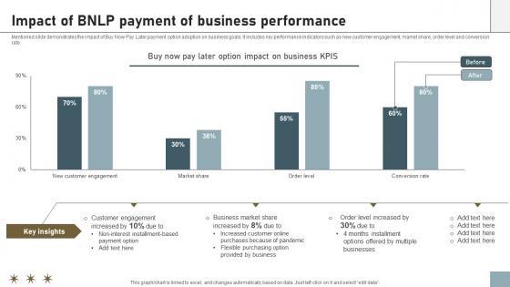 Mentioned slide demonstrates the impact of Buy Now Pay Later payment option adoption on business goals. It includes key performance indicators such as new customer engagement, market share, order level and conversion rate. There are so many reasons you need a Online Payment Techniques Impact Of BNLP Payment Of Business Performance. The first reason is you can not spend time making everything from scratch, Thus, Slidegeeks has made presentation templates for you too. You can easily download these templates from our website easily. Mentioned slide demonstrates the impact of Buy Now Pay Later payment option adoption on business goals. It includes key performance indicators such as new customer engagement, market share, order level and conversion rate.