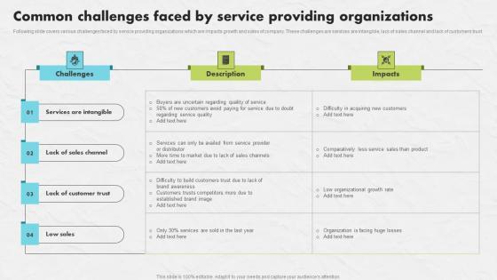 Following slide covers various challenges faced by service providing organizations which are impacts growth and sales of company. These challenges are services are intangible, lack of sales channel and lack of customers trust. Slidegeeks is one of the best resources for PowerPoint templates. You can download easily and regulate Common Challenges Faced Developing An Impactful SEO Marketing Plan Information Pdf for your personal presentations from our wonderful collection. A few clicks is all it takes to discover and get the most relevant and appropriate templates. Use our Templates to add a unique zing and appeal to your presentation and meetings. All the slides are easy to edit and you can use them even for advertisement purposes. Following slide covers various challenges faced by service providing organizations which are impacts growth and sales of company. These challenges are services are intangible, lack of sales channel and lack of customers trust.
