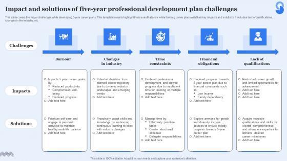 This slide covers the major challenges while developing 5 year career plans. This template aims to highlight the issues that arise while forming career plans with their key impacts and solutions. It includes lack of qualifications, changes in the industry, etc. Showcasing this set of slides titled Impact And Solutions Of Five Year Professional Development Plan Challenges Graphics Pdf. The topics addressed in these templates are Changes In Industry, Time Constraints, Financial Obligations. All the content presented in this PPT design is completely editable. Download it and make adjustments in color, background, font etc. as per your unique business setting. This slide covers the major challenges while developing 5 year career plans. This template aims to highlight the issues that arise while forming career plans with their key impacts and solutions. It includes lack of qualifications, changes in the industry, etc.