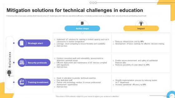 Following slide showcases solutions that helps to solve IoT challenges and improves operational efficiency. It includes pointers such as strategic start, security protocols and training investment. Take your projects to the next level with our ultimate collection of Mitigation Solutions For Technical Challenges Impact Of IoT Technology On Education IoT SS V. Slidegeeks has designed a range of layouts that are perfect for representing task or activity duration, keeping track of all your deadlines at a glance. Tailor these designs to your exact needs and give them a truly corporate look with your own brand colors they will make your projects stand out from the rest Following slide showcases solutions that helps to solve IoT challenges and improves operational efficiency. It includes pointers such as strategic start, security protocols and training investment.