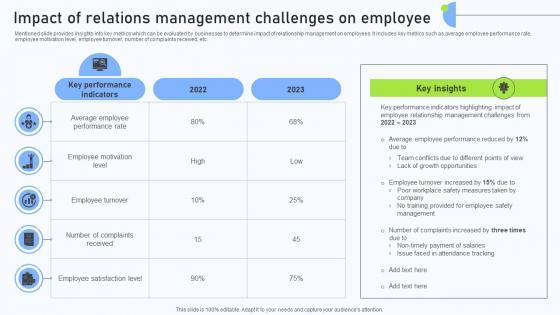 Mentioned slide provides insights into key metrics which can be evaluated by businesses to determine impact of relationship management on employees. It includes key metrics such as average employee performance rate, employee motivation level, employee turnover, number of complaints received, etc. Make sure to capture your audiences attention in your business displays with our gratis customizable Relationship Management Automation Impact Of Relations Management Challenges. These are great for business strategies, office conferences, capital raising or task suggestions. If you desire to acquire more customers for your tech business and ensure they stay satisfied, create your own sales presentation with these plain slides. Mentioned slide provides insights into key metrics which can be evaluated by businesses to determine impact of relationship management on employees. It includes key metrics such as average employee performance rate, employee motivation level, employee turnover, number of complaints received, etc.