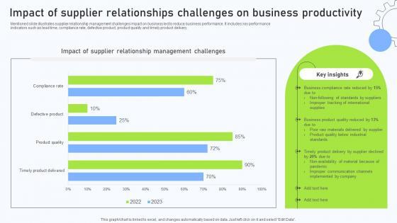 Mentioned slide illustrates supplier relationship management challenges impact on business led to reduce business performance. It includes key performance indicators such as lead time, compliance rate, defective product, product quality and timely product delivery. Slidegeeks is one of the best resources for PowerPoint templates. You can download easily and regulate Relationship Management Automation Software Impact Of Supplier Relationships Challenges for your personal presentations from our wonderful collection. A few clicks is all it takes to discover and get the most relevant and appropriate templates. Use our Templates to add a unique zing and appeal to your presentation and meetings. All the slides are easy to edit and you can use them even for advertisement purposes. Mentioned slide illustrates supplier relationship management challenges impact on business led to reduce business performance. It includes key performance indicators such as lead time, compliance rate, defective product, product quality and timely product delivery.