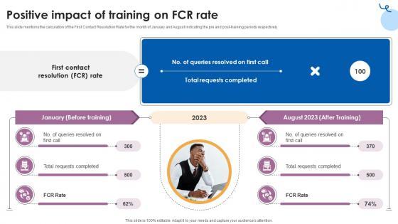 This slide mentions the calculation of the First Contact Resolution Rate for the month of January and August indicating the pre and post-training periods respectively Presenting this PowerPoint presentation, titled Positive Impact Of Training On FCR Rate Customer Service Training Ppt Slide with topics curated by our researchers after extensive research. This editable presentation is available for immediate download and provides attractive features when used. Download now and captivate your audience. Presenting this Positive Impact Of Training On FCR Rate Customer Service Training Ppt Slide Our researchers have carefully researched and created these slides with all aspects taken into consideration. This is a completely customizable Positive Impact Of Training On FCR Rate Customer Service Training Ppt Slide that is available for immediate downloading. Download now and make an impact on your audience. Highlight the attractive features available with our PPTs. This slide mentions the calculation of the First Contact Resolution Rate for the month of January and August indicating the pre and post-training periods respectively