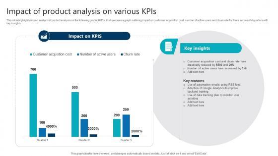This slide highlights impact analysis of product analysis on the following product KPIs. It showcases a graph outlining impact on customer acquisition cost, number of active users and churn rate for three successful quarters with key insights Are you searching for a Impact Of Product Analysis On Various Kpis Product Analytics Implementation Data Analytics V that is uncluttered, straightforward, and original Its easy to edit, and you can change the colors to suit your personal or business branding. For a presentation that expresses how much effort you have put in, this template is ideal With all of its features, including tables, diagrams, statistics, and lists, its perfect for a business plan presentation. Make your ideas more appealing with these professional slides. Download Impact Of Product Analysis On Various Kpis Product Analytics Implementation Data Analytics V from Slidegeeks today. This slide highlights impact analysis of product analysis on the following product KPIs. It showcases a graph outlining impact on customer acquisition cost, number of active users and churn rate for three successful quarters with key insights