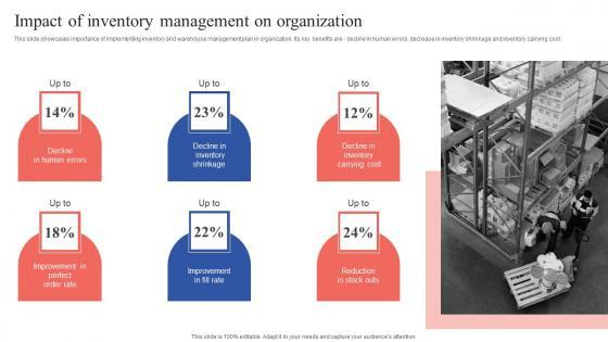 This slide showcases importance of implementing inventory and warehouse management plan in organization. Its key benefits are decline in human errors, decrease in inventory shrinkage and inventory carrying cost. Formulating a presentation can take up a lot of effort and time, so the content and message should always be the primary focus. The visuals of the PowerPoint can enhance the presenters message, so our Impact Of Inventory Management On Organization Sample PDF was created to help save time. Instead of worrying about the design, the presenter can concentrate on the message while our designers work on creating the ideal templates for whatever situation is needed. Slidegeeks has experts for everything from amazing designs to valuable content, we have put everything into Impact Of Inventory Management On Organization Sample PDF.
