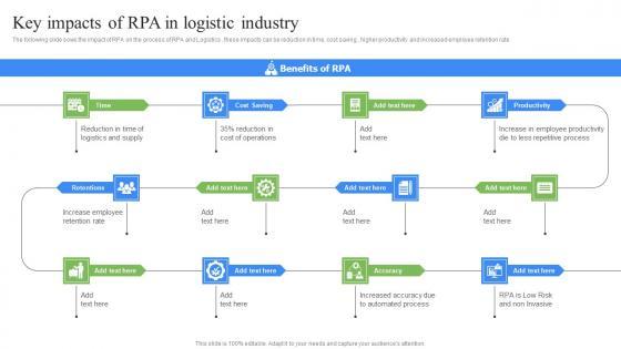 The following slide sows the impact of RPA on the process of RPA and Logistics , these impacts can be reduction in time, cost saving , higher productivity and increased employee retention rate. This Key Impacts Of RPA In Logistic Industry RPA Influence On Industries Diagrams Pdf is perfect for any presentation, be it in front of clients or colleagues. It is a versatile and stylish solution for organizing your meetings. The Key Impacts Of RPA In Logistic Industry RPA Influence On Industries Diagrams Pdf features a modern design for your presentation meetings. The adjustable and customizable slides provide unlimited possibilities for acing up your presentation. Slidegeeks has done all the homework before launching the product for you. So, do not wait, grab the presentation templates today The following slide sows the impact of RPA on the process of RPA and Logistics , these impacts can be reduction in time, cost saving , higher productivity and increased employee retention rate.