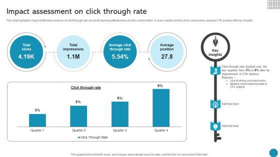 This slide highlights impact of attribution analysis on click through rate aimed at improving effectiveness of call to action button. It covers details on total clicks, impressions, average CTR, position with key insights The Impact Assessment On Click Through Rate Driving Business Success Integrating Product is a compilation of the most recent design trends as a series of slides. It is suitable for any subject or industry presentation, containing attractive visuals and photo spots for businesses to clearly express their messages. This template contains a variety of slides for the user to input data, such as structures to contrast two elements, bullet points, and slides for written information. Slidegeeks is prepared to create an impression. This slide highlights impact of attribution analysis on click through rate aimed at improving effectiveness of call to action button. It covers details on total clicks, impressions, average CTR, position with key insights