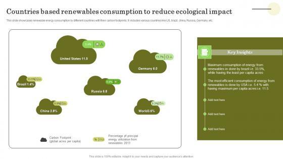 This slide showcases renewable energy consumption by different countries with their carbon footprints. It includes various countries like US, brazil, china, Russia, Germany, etc. Pitch your topic with ease and precision using this Countries Based Renewables Consumption To Reduce Ecological Impact Professional Pdf This layout presents information on Countries Based, Renewables Consumption, Ecological Impact It is also available for immediate download and adjustment. So, changes can be made in the color, design, graphics or any other component to create a unique layout. This slide showcases renewable energy consumption by different countries with their carbon footprints. It includes various countries like US, brazil, china, Russia, Germany, etc.