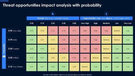 From laying roadmaps to briefing everything in detail, our templates are perfect for you. You can set the stage with your presentation slides. All you have to do is download these easy-to-edit and customizable templates. Threat Opportunities Impact Analysis With Probability will help you deliver an outstanding performance that everyone would remember and praise you for. Do download this presentation today. The threat opportunities impact analysis with probability slides creates visually appealing foundation for any topic. It helps to deliver polished, professional presentations and effectively engage audience with impactful visuals.