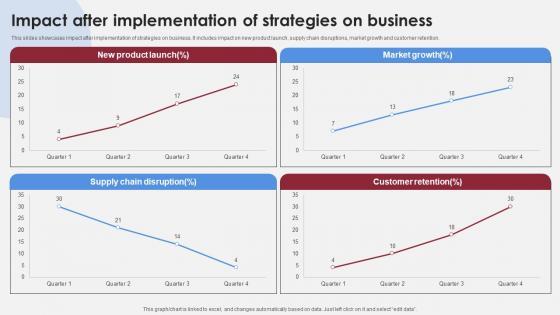 This slides showcases impact after implementation of strategies on business. It includes impact on new product launch, supply chain disruptions, market growth and customer retention. Coming up with a presentation necessitates that the majority of the effort goes into the content and the message you intend to convey. The visuals of a PowerPoint presentation can only be effective if it supplements and supports the story that is being told. Keeping this in mind our experts created Impact After Implementation Of Strategies Accelerating Market Share And Profitability MKT SS V to reduce the time that goes into designing the presentation. This way, you can concentrate on the message while our designers take care of providing you with the right template for the situation. This slides showcases impact after implementation of strategies on business. It includes impact on new product launch, supply chain disruptions, market growth and customer retention.