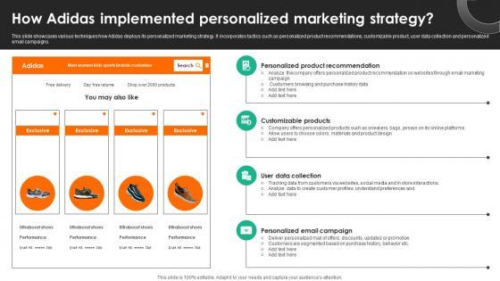 This slide showcases various techniques how Adidas deploys its personalized marketing strategy. It incorporates tactics such as personalized product recommendations, customizable product, user data collection and personalized email campaigns. Do you have an important presentation coming up Are you looking for something that will make your presentation stand out from the rest Look no further than How Adidas Implemented Personalized Evaluating Adidas Branding And Advertising Strategy SS V. With our professional designs, you can trust that your presentation will pop and make delivering it a smooth process. And with Slidegeeks, you can trust that your presentation will be unique and memorable. So why wait Grab How Adidas Implemented Personalized Evaluating Adidas Branding And Advertising Strategy SS V today and make your presentation stand out from the rest This slide showcases various techniques how Adidas deploys its personalized marketing strategy. It incorporates tactics such as personalized product recommendations, customizable product, user data collection and personalized email campaigns.