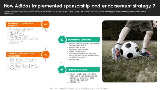This slide showcases various techniques how Adidas executes it sponsorship and endorsement strategy. It incorporates strategies such as sports team and event sponsorship, athlete endorsement, partnership with influencer, etc. Slidegeeks is here to make your presentations a breeze with How Adidas Implemented Experiential Evaluating Adidas Branding And Advertising Strategy SS V With our easy-to-use and customizable templates, you can focus on delivering your ideas rather than worrying about formatting. With a variety of designs to choose from, you are sure to find one that suits your needs. And with animations and unique photos, illustrations, and fonts, you can make your presentation pop. So whether you are giving a sales pitch or presenting to the board, make sure to check out Slidegeeks first This slide showcases various techniques how Adidas executes it sponsorship and endorsement strategy. It incorporates strategies such as sports team and event sponsorship, athlete endorsement, partnership with influencer, etc.
