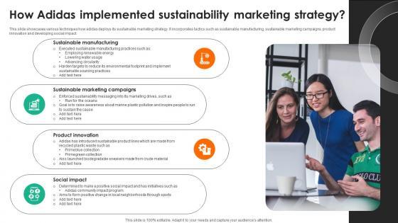 This slide showcases various techniques how Adidas deploys its sustainable marketing strategy. It incorporates tactics such as sustainable manufacturing, sustainable marketing campaigns, product innovation and developing social impact. If your project calls for a presentation, then Slidegeeks is your go-to partner because we have professionally designed, easy-to-edit templates that are perfect for any presentation. After downloading, you can easily edit How Adidas Implemented Sustainability Evaluating Adidas Branding And Advertising Strategy SS V and make the changes accordingly. You can rearrange slides or fill them with different images. Check out all the handy templates This slide showcases various techniques how Adidas deploys its sustainable marketing strategy. It incorporates tactics such as sustainable manufacturing, sustainable marketing campaigns, product innovation and developing social impact.