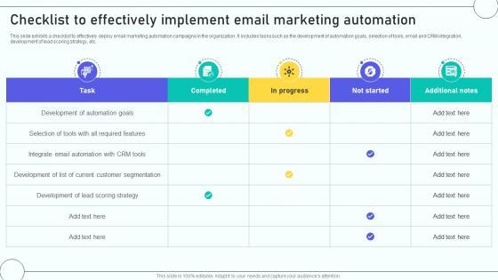 This slide exhibits a checklist to effectively deploy email marketing automation campaigns in the organization. It includes tasks such as the development of automation goals, selection of tools, email and CRM integration, development of lead scoring strategy, etc. Slidegeeks is here to make your presentations a breeze with Email Marketing Automation Process Checklist To Effectively Implement Email With our easy-to-use and customizable templates, you can focus on delivering your ideas rather than worrying about formatting. With a variety of designs to choose from, you are sure to find one that suits your needs. And with animations and unique photos, illustrations, and fonts, you can make your presentation pop. So whether you are giving a sales pitch or presenting to the board, make sure to check out Slidegeeks first This slide exhibits a checklist to effectively deploy email marketing automation campaigns in the organization. It includes tasks such as the development of automation goals, selection of tools, email and CRM integration, development of lead scoring strategy, etc.