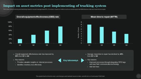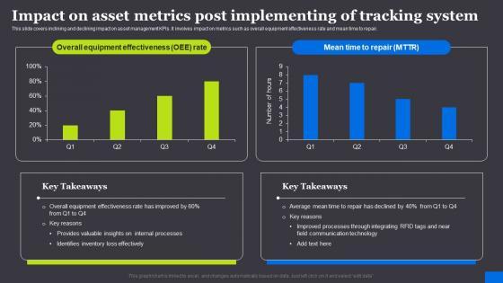 This slide covers inclining and declining impact on asset management KPIs. It involves impact on metrics such as overall equipment effectiveness rate and mean time to repair. From laying roadmaps to briefing everything in detail, our templates are perfect for you. You can set the stage with your presentation slides. All you have to do is download these easy-to-edit and customizable templates. Impact On Asset Metrics Post Implementing Of Tech Asset Management Pictures Pdf will help you deliver an outstanding performance that everyone would remember and praise you for. Do download this presentation today. This slide covers inclining and declining impact on asset management KPIs. It involves impact on metrics such as overall equipment effectiveness rate and mean time to repair.