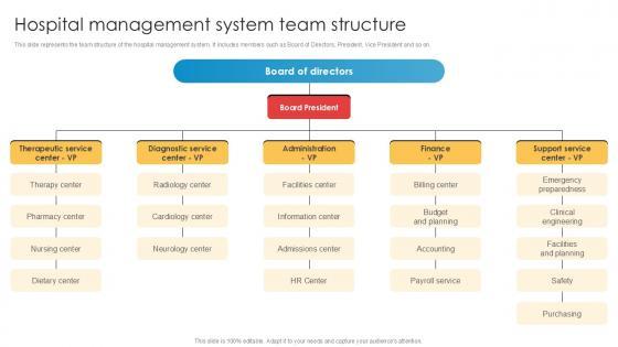 This slide represents the team structure of the hospital management system. It includes members such as Board of Directors, President, Vice President and so on. Formulating a presentation can take up a lot of effort and time, so the content and message should always be the primary focus. The visuals of the PowerPoint can enhance the presenters message, so our Hospital Management System Team Structure Implementation Of Online Ppt Slides was created to help save time. Instead of worrying about the design, the presenter can concentrate on the message while our designers work on creating the ideal templates for whatever situation is needed. Slidegeeks has experts for everything from amazing designs to valuable content, we have put everything into Hospital Management System Team Structure Implementation Of Online Ppt Slides This slide represents the team structure of the hospital management system. It includes members such as Board of Directors, President, Vice President and so on.