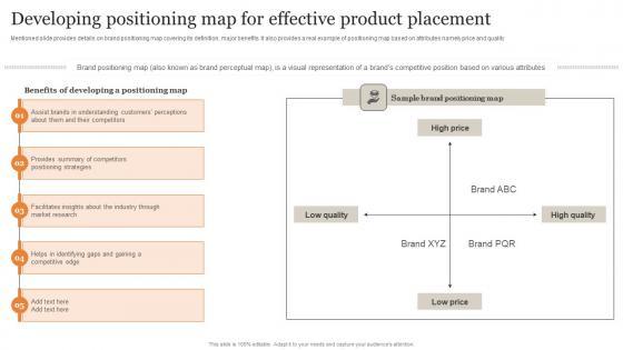 Mentioned slide provides details on brand positioning map covering its definition, major benefits. It also provides a real example of positioning map based on attributes namely price and quality. Are you searching for a Developing Positioning Map For Effective Product Placement Ultimate Guide Implementing Graphics Pdf that is uncluttered, straightforward, and original It is easy to edit, and you can change the colors to suit your personal or business branding. For a presentation that expresses how much effort you have put in, this template is ideal With all of its features, including tables, diagrams, statistics, and lists, it is perfect for a business plan presentation. Make your ideas more appealing with these professional slides. Download Developing Positioning Map For Effective Product Placement Ultimate Guide Implementing Graphics Pdf from Slidegeeks today. Mentioned slide provides details on brand positioning map covering its definition, major benefits. It also provides a real example of positioning map based on attributes namely price and quality.