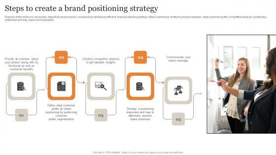 Purpose of this slide is to showcase steps that can be used by companies to develop an effective brand positioning strategy. Steps covered are related to product overview, ideal customer profile, competitive analysis, positioning statement and map, brand communication. Boost your pitch with our creative Steps To Create A Brand Positioning Strategy Ultimate Guide Implementing Demonstration Pdf Deliver an awe-inspiring pitch that will mesmerize everyone. Using these presentation templates you will surely catch everyones attention. You can browse the ppts collection on our website. We have researchers who are experts at creating the right content for the templates. So you do not have to invest time in any additional work. Just grab the template now and use them. Purpose of this slide is to showcase steps that can be used by companies to develop an effective brand positioning strategy. Steps covered are related to product overview, ideal customer profile, competitive analysis, positioning statement and map, brand communication.