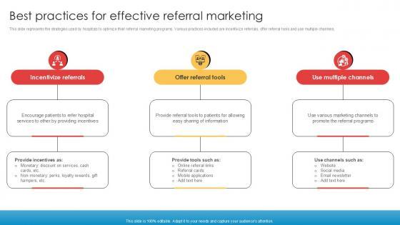 This slide represents the strategies used by hospitals to optimize their referral marketing programs. Various practices included are incentivize referrals, offer referral tools and use multiple channels. Want to ace your presentation in front of a live audience Our Best Practices For Effective Referral Marketing Implementation Of Online Ppt Slides can help you do that by engaging all the users towards you. Slidegeeks experts have put their efforts and expertise into creating these impeccable powerpoint presentations so that you can communicate your ideas clearly. Moreover, all the templates are customizable, and easy-to-edit and downloadable. Use these for both personal and commercial use. This slide represents the strategies used by hospitals to optimize their referral marketing programs. Various practices included are incentivize referrals, offer referral tools and use multiple channels.