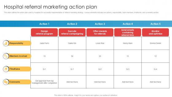 This slide outlines the action plan used by hospitals for successful implementation of referral marketing strategy. Various elements included are actions, responsibility, team members, timeframe, and comments section. Explore a selection of the finest Hospital Referral Marketing Action Plan Implementation Of Online Ppt Template here. With a plethora of professionally designed and pre-made slide templates, you can quickly and easily find the right one for your upcoming presentation. You can use our Hospital Referral Marketing Action Plan Implementation Of Online Ppt Template to effectively convey your message to a wider audience. Slidegeeks has done a lot of research before preparing these presentation templates. The content can be personalized and the slides are highly editable. Grab templates today from Slidegeeks. This slide outlines the action plan used by hospitals for successful implementation of referral marketing strategy. Various elements included are actions, responsibility, team members, timeframe, and comments section.