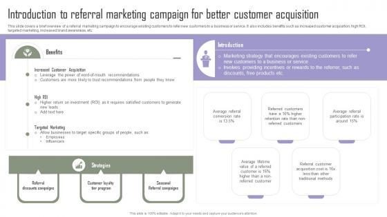 This slide covers a brief overview of a referral marketing campaign to encourage existing customers to refer new customers to a business or service. It also includes benefits such as increased customer acquisition, high ROI, targeted marketing, increased brand awareness, etc. Slidegeeks has constructed Introduction To Referral Implementing Marketing Tactics To Drive Summary Pdf after conducting extensive research and examination. These presentation templates are constantly being generated and modified based on user preferences and critiques from editors. Here, you will find the most attractive templates for a range of purposes while taking into account ratings and remarks from users regarding the content. This is an excellent jumping off point to explore our content and will give new users an insight into our top notch PowerPoint Templates. This slide covers a brief overview of a referral marketing campaign to encourage existing customers to refer new customers to a business or service. It also includes benefits such as increased customer acquisition, high ROI, targeted marketing, increased brand awareness, etc.
