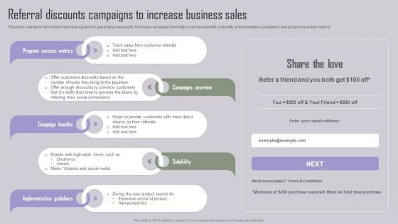 This slide overviews discounted referral programs for generating new leads. It includes campaign information such as benefits, suitability, implementation guidelines, and program success metrics.Find a pre designed and impeccable Referral Discounts Campaigns Implementing Social Media Tactics For Boosting WOM Infographics Pdf. The templates can ace your presentation without additional effort. You can download these easy to edit presentation templates to make your presentation stand out from others. So, what are you waiting for Download the template from Slidegeeks today and give a unique touch to your presentation. This slide overviews discounted referral programs for generating new leads. It includes campaign information such as benefits, suitability, implementation guidelines, and program success metrics.