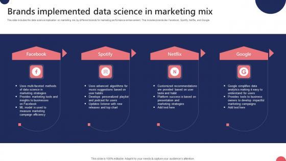 This slide includes the data science implication on marketing mix by different brands for marketing performance enhancement. This includes brands like Facebook, Spotify, Netflix, and Google. Showcasing this set of slides titled Brands Implemented Data Science In Marketing Mix Ppt Show Samples Pdf. The topics addressed in these templates are Facebook, Spotify, Netflix, Google. All the content presented in this PPT design is completely editable. Download it and make adjustments in color, background, font etc. as per your unique business setting. This slide includes the data science implication on marketing mix by different brands for marketing performance enhancement. This includes brands like Facebook, Spotify, Netflix, and Google.