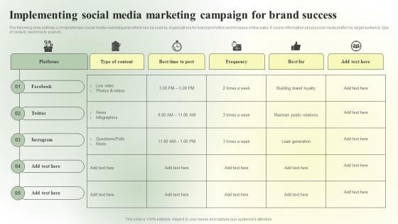 The following slide outlines a comprehensive social media marketing plan which can be used by organizations for brand promotion and increase online sales. It covers information about social media platforms, target audience, type of content, best time to post etc. Get a simple yet stunning designed Implementing Social Media Marketing Campaign For Brand Success Clipart PDF. It is the best one to establish the tone in your meetings. It is an excellent way to make your presentations highly effective. So, download this PPT today from Slidegeeks and see the positive impacts. Our easy to edit Implementing Social Media Marketing Campaign For Brand Success Clipart PDF can be your go to option for all upcoming conferences and meetings. So, what are you waiting for Grab this template today.