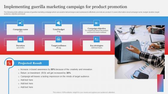 The following slide outlines overview of guerilla marketing campaign which can assist small and large scale businesses to effectively promote any product. It covers information about campaign name, budget, duration, target audience, objective and result. If you are looking for a format to display your unique thoughts, then the professionally designed Competitive Branding Strategic Implementing Guerilla Marketing Campaign Clipart PDF is the one for you. You can use it as a Google Slides template or a PowerPoint template. Incorporate impressive visuals, symbols, images, and other charts. Modify or reorganize the text boxes as you desire. Experiment with shade schemes and font pairings. Alter, share or cooperate with other people on your work. Download Competitive Branding Strategic Implementing Guerilla Marketing Campaign Clipart PDF and find out how to give a successful presentation. Present a perfect display to your team and make your presentation unforgettable. The following slide outlines overview of guerilla marketing campaign which can assist small and large scale businesses to effectively promote any product. It covers information about campaign name, budget, duration, target audience, objective and result.