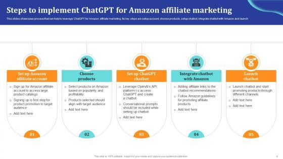 This slides showcases process that can help to leverage ChatGPT for Amazon affiliate marketing. Its key steps are setup account, choose products, setup chatbot, integrate chatbot with Amazon and launch. Present like a pro with ChatGpt Comprehensive Guide Steps To Implement ChatGpt For Amazon Ppt Slides ChatGpt SS V. Create beautiful presentations together with your team, using our easy-to-use presentation slides. Share your ideas in real-time and make changes on the fly by downloading our templates. So whether you are in the office, on the go, or in a remote location, you can stay in sync with your team and present your ideas with confidence. With Slidegeeks presentation got a whole lot easier. Grab these presentations today. This slides showcases process that can help to leverage ChatGPT for Amazon affiliate marketing. Its key steps are setup account, choose products, setup chatbot, integrate chatbot with Amazon and launch.