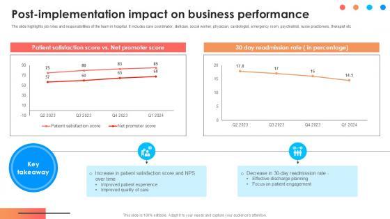 The slide highlights job roles and responsibilities of the team in hospital. It includes care coordinator, dietician, social worker, physician, cardiologist, emergency room, psychiatrist, nurse practioners, therapist etc. If you are looking for a format to display your unique thoughts, then the professionally designed Post Implementation Impact On Comprehensive Approach To Strategic Planning Ppt Slide is the one for you. You can use it as a Google Slides template or a PowerPoint template. Incorporate impressive visuals, symbols, images, and other charts. Modify or reorganize the text boxes as you desire. Experiment with shade schemes and font pairings. Alter, share or cooperate with other people on your work. Download Post Implementation Impact On Comprehensive Approach To Strategic Planning Ppt Slide and find out how to give a successful presentation. Present a perfect display to your team and make your presentation unforgettable. The slide highlights job roles and responsibilities of the team in hospital. It includes care coordinator, dietician, social worker, physician, cardiologist, emergency room, psychiatrist, nurse practioners, therapist etc