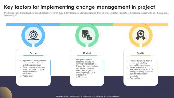 This slide represents details related to key factors to be kept in mind for effectively deploying changes in organizational projects. It includes details related to key factors for deploying change management in project such as scope, budget and quality. Coming up with a presentation necessitates that the majority of the effort goes into the content and the message you intend to convey. The visuals of a PowerPoint presentation can only be effective if it supplements and supports the story that is being told. Keeping this in mind our experts created Key Factors For Implementing Change Digital Transformation In Project Management to reduce the time that goes into designing the presentation. This way, you can concentrate on the message while our designers take care of providing you with the right template for the situation. This slide represents details related to key factors to be kept in mind for effectively deploying changes in organizational projects. It includes details related to key factors for deploying change management in project such as scope, budget and quality.