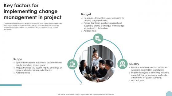 This slide represents details related to key factors to be kept in mind for effectively deploying changes in organizational projects. It includes details related to key factors for deploying change management in project such as scope, budget and quality. Welcome to our selection of the The Digital Project Managers Key Factors For Implementing Change Management In Project. These are designed to help you showcase your creativity and bring your sphere to life. Planning and Innovation are essential for any business that is just starting out. This collection contains the designs that you need for your everyday presentations. All of our PowerPoints are 100Percent editable, so you can customize them to suit your needs. This multi-purpose template can be used in various situations. Grab these presentation templates today. This slide represents details related to key factors to be kept in mind for effectively deploying changes in organizational projects. It includes details related to key factors for deploying change management in project such as scope, budget and quality.