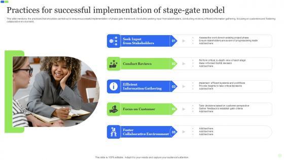This slide mentions the practices that should be carried out to ensure successful implementation of phase gate framework. It includes seeking input from stakeholders, conducting reviews, efficient information gathering, focusing on customers and fostering collaborative environment. Showcasing this set of slides titled Practices For Successful Implementation Of Stage Gate Model Icons Pdf. The topics addressed in these templates are Efficient Information Gathering, Focus On Customer, Foster Collaborative Environment. All the content presented in this PPT design is completely editable. Download it and make adjustments in color, background, font etc. as per your unique business setting. This slide mentions the practices that should be carried out to ensure successful implementation of phase gate framework. It includes seeking input from stakeholders, conducting reviews, efficient information gathering, focusing on customers and fostering collaborative environment.
