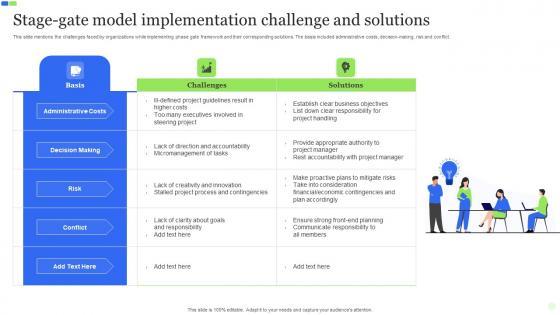 This slide mentions the challenges faced by organizations while implementing phase gate framework and their corresponding solutions. The basis included administrative costs, decision-making, risk and conflict. Showcasing this set of slides titled Stage Gate Model Implementation Challenge And Solutions Icons Pdf. The topics addressed in these templates are Stage Gate Model Implementation, Challenge And Solutions, Administrative Costs, Decision Making. All the content presented in this PPT design is completely editable. Download it and make adjustments in color, background, font etc. as per your unique business setting. This slide mentions the challenges faced by organizations while implementing phase gate framework and their corresponding solutions. The basis included administrative costs, decision-making, risk and conflict.