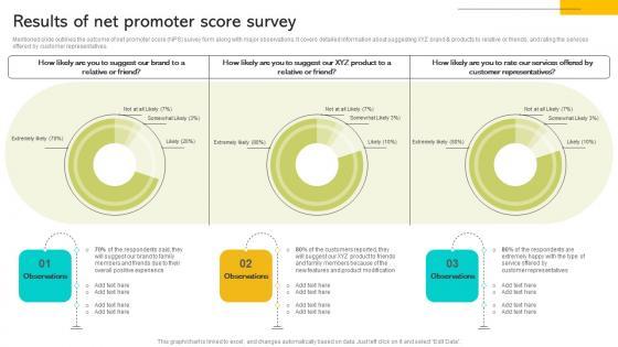 Mentioned slide outlines the outcome of net promoter score NPS survey form along with major observations. It covers detailed information about suggesting XYZ brand and products to relative or friends, and rating the services offered by customer representatives. Take your projects to the next level with our ultimate collection of Implementing Strategies To Enhance Results Of Net Promoter Score Survey Summary PDF Slidegeeks has designed a range of layouts that are perfect for representing task or activity duration, keeping track of all your deadlines at a glance. Tailor these designs to your exact needs and give them a truly corporate look with your own brand colors they will make your projects stand out from the rest Mentioned slide outlines the outcome of net promoter score NPS survey form along with major observations. It covers detailed information about suggesting XYZ brand and products to relative or friends, and rating the services offered by customer representatives.