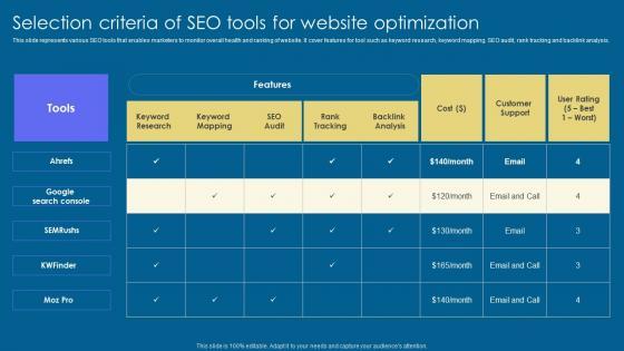 This slide represents various SEO tools that enables marketers to monitor overall health and ranking of website. It cover features for tool such as keyword research, keyword mapping. SEO audit, rank tracking and backlink analysis. Whether you have daily or monthly meetings, a brilliant presentation is necessary. Selection Criteria SEO Tools Implementation Of Digital Advertising Strategies Demonstration Pdf can be your best option for delivering a presentation. Represent everything in detail using Selection Criteria SEO Tools Implementation Of Digital Advertising Strategies Demonstration Pdf and make yourself stand out in meetings. The template is versatile and follows a structure that will cater to your requirements. All the templates prepared by Slidegeeks are easy to download and edit. Our research experts have taken care of the corporate themes as well. So, give it a try and see the results. This slide represents various SEO tools that enables marketers to monitor overall health and ranking of website. It cover features for tool such as keyword research, keyword mapping. SEO audit, rank tracking and backlink analysis.