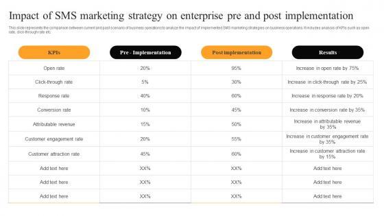 This slide represents the comparison between current and past scenario of business operations to analyze the impact of implemented SMS marketing strategies on business operations. It includes analysis of KPIs such as open rate, click-through rate etc. Are you searching for a Impact Of SMS Marketing Strategy On Enterprise Pre And Post Implementation Icons PDF that is uncluttered, straightforward, and original. Its easy to edit, and you can change the colors to suit your personal or business branding. For a presentation that expresses how much effort youve put in, this template is ideal. With all of its features, including tables, diagrams, statistics, and lists, its perfect for a business plan presentation. Make your ideas more appealing with these professional slides. Download Impact Of SMS Marketing Strategy On Enterprise Pre And Post Implementation Icons PDF from Slidegeeks today.