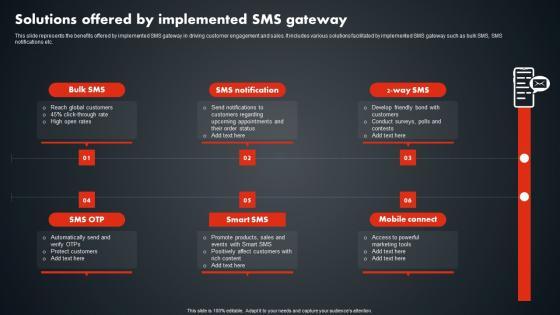 This slide represents the benefits offered by implemented SMS gateway in driving customer engagement and sales. It includes various solutions facilitated by implemented SMS gateway such as bulk SMS, SMS notifications etc.Slidegeeks is here to make your presentations a breeze with Solutions Offered By Implemented SMS Gateway Download PDF With our easy-to-use and customizable templates, you can focus on delivering your ideas rather than worrying about formatting. With a variety of designs to choose from, you are sure to find one that suits your needs. And with animations and unique photos, illustrations, and fonts, you can make your presentation pop. So whether youre giving a sales pitch or presenting to the board, make sure to check out Slidegeeks first.