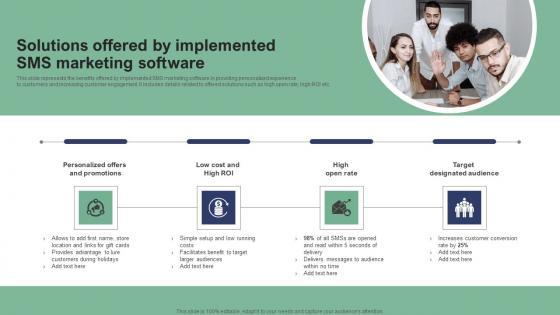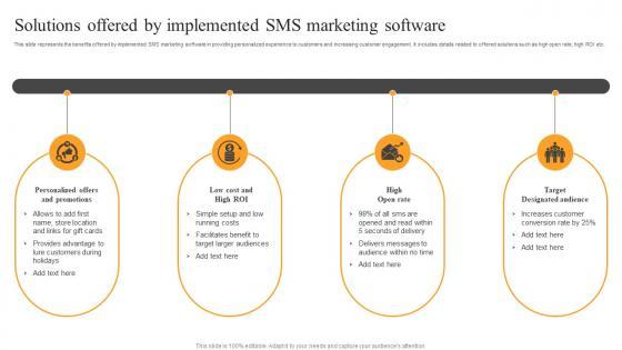 This slide represents the benefits offered by implemented SMS marketing software in providing personalized experience to customers and increasing customer engagement. It includes details related to offered solutions such as high open rate, high ROI etc. If your project calls for a presentation, then Slidegeeks is your go to partner because we have professionally designed, easy to edit templates that are perfect for any presentation. After downloading, you can easily edit Solutions Offered By Implemented SMS Text Message Advertising Solutions Enhancing Mockup Pdf and make the changes accordingly. You can rearrange slides or fill them with different images. Check out all the handy templates This slide represents the benefits offered by implemented SMS marketing software in providing personalized experience to customers and increasing customer engagement. It includes details related to offered solutions such as high open rate, high ROI etc.