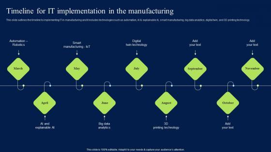 This slide outlines the timeline to implementing IT in manufacturing and it includes technologies such as automation, AI and explainable AI, smart manufacturing, big data analytics, digital twin, and 3D printing technology. Make sure to capture your audiences attention in your business displays with our gratis customizable Timeline For IT Implementation In The Manufacturing Artificial Intelligence Impact Ideas PDF. These are great for business strategies, office conferences, capital raising or task suggestions. If you desire to acquire more customers for your tech business and ensure they stay satisfied, create your own sales presentation with these plain slides. This slide outlines the timeline to implementing IT in manufacturing and it includes technologies such as automation, AI and explainable AI, smart manufacturing, big data analytics, digital twin, and 3D printing technology.