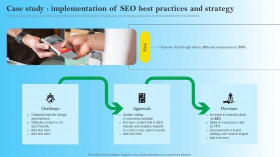 This slide represents use case for deployment of SEO practices and strategies. It includes goal, key challenges, approaches and final outcome for the implementation. This Strategic Ecommerce Plan For B2B Enterprises Case Study Implementation Of SEO Best Practices Microsoft PDF from Slidegeeks makes it easy to present information on your topic with precision. It provides customization options, so you can make changes to the colors, design, graphics, or any other component to create a unique layout. It is also available for immediate download, so you can begin using it right away. Slidegeeks has done good research to ensure that you have everything you need to make your presentation stand out. Make a name out there for a brilliant performance.