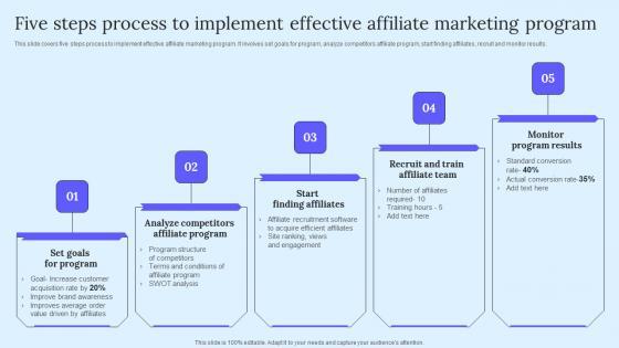 This slide covers five steps process to implement effective affiliate marketing program. It involves set goals for program, analyze competitors affiliate program, start finding affiliates, recruit and monitor results. Explore a selection of the finest Five Steps Process To Implement B2B Marketing Techniques To Attract Potential Pictures Pdf here. With a plethora of professionally designed and pre made slide templates, you can quickly and easily find the right one for your upcoming presentation. You can use our Five Steps Process To Implement B2B Marketing Techniques To Attract Potential Pictures Pdf to effectively convey your message to a wider audience. Slidegeeks has done a lot of research before preparing these presentation templates. The content can be personalized and the slides are highly editable. Grab templates today from Slidegeeks. This slide covers five steps process to implement effective affiliate marketing program. It involves set goals for program, analyze competitors affiliate program, start finding affiliates, recruit and monitor results.
