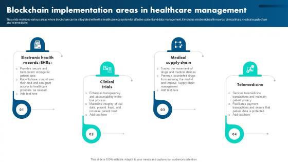 This slide mentions various areas where blockchain can be integrated within the healthcare ecosystem for effective patient and data management, It includes electronic health records, clinical trials, medical supply chain and telemedicine. Find highly impressive How Blockchain Is Reshaping Blockchain Implementation Areas In Healthcare BCT SS V on Slidegeeks to deliver a meaningful presentation. You can save an ample amount of time using these presentation templates. No need to worry to prepare everything from scratch because Slidegeeks experts have already done a huge research and work for you. You need to download How Blockchain Is Reshaping Blockchain Implementation Areas In Healthcare BCT SS V for your upcoming presentation. All the presentation templates are 100 percent editable and you can change the color and personalize the content accordingly. Download now This slide mentions various areas where blockchain can be integrated within the healthcare ecosystem for effective patient and data management, It includes electronic health records, clinical trials, medical supply chain and telemedicine.