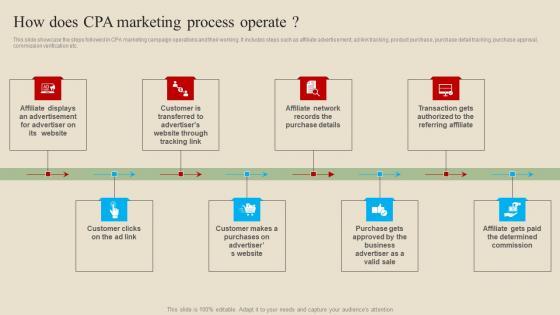 This slide showcase the steps followed in CPA marketing campaign operations and their working. It includes steps such as affiliate advertisement, ad link tracking, product purchase, purchase detail tracking, purchase approval, commission verification etc. Slidegeeks has constructed Strategies For Implementing CPA Marketing How Does CPA Marketing Process Operate Information PDF after conducting extensive research and examination. These presentation templates are constantly being generated and modified based on user preferences and critiques from editors. Here, you will find the most attractive templates for a range of purposes while taking into account ratings and remarks from users regarding the content. This is an excellent jumping-off point to explore our content and will give new users an insight into our top-notch PowerPoint Templates.
