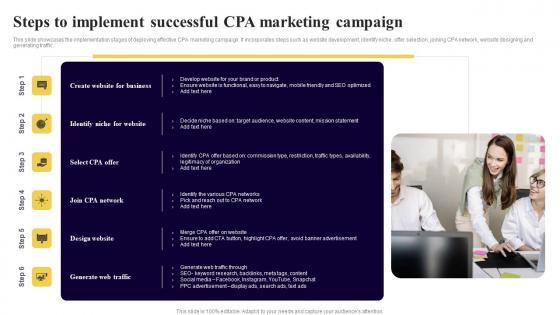 This slide showcases the implementation stages of deploying effective CPA marketing campaign. It incorporates steps such as website development, identify niche, offer selection, joining CPA network, website designing and generating traffic. Explore a selection of the finest Integrating CPA Marketing Steps To Implement Successful CPA Marketing Campaign Infographics PDF here. With a plethora of professionally designed and pre-made slide templates, you can quickly and easily find the right one for your upcoming presentation. You can use our Integrating CPA Marketing Steps To Implement Successful CPA Marketing Campaign Infographics PDF to effectively convey your message to a wider audience. Slidegeeks has done a lot of research before preparing these presentation templates. The content can be personalized and the slides are highly editable. Grab templates today from Slidegeeks.