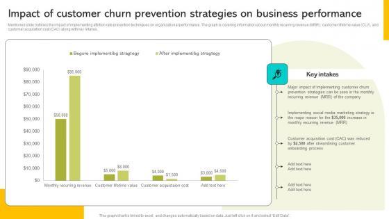 Mentioned slide outlines the impact of implementing attrition rate prevention techniques on organizational performance. The graph is covering information about monthly recurring revenue MRR, customer lifetime value CLV, and customer acquisition cost CAC along with key intakes. Formulating a presentation can take up a lot of effort and time, so the content and message should always be the primary focus. The visuals of the PowerPoint can enhance the presenters message, so our Implementing Strategies To Enhance Impact Of Customer Churn Prevention Strategies On Pictures PDF was created to help save time. Instead of worrying about the design, the presenter can concentrate on the message while our designers work on creating the ideal templates for whatever situation is needed. Slidegeeks has experts for everything from amazing designs to valuable content, we have put everything into Implementing Strategies To Enhance Impact Of Customer Churn Prevention Strategies On Pictures PDF Mentioned slide outlines the impact of implementing attrition rate prevention techniques on organizational performance. The graph is covering information about monthly recurring revenue MRR, customer lifetime value CLV, and customer acquisition cost CAC along with key intakes.