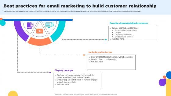 The following slide illustrates some tips to build connection through email promotion and improve sigh ups. It includes elements such as providing downloadable brochures, displaying pop-ups, including opt-in forms etc.Present like a pro with Best Practices For Email Marketing To Build Customer Key Step To Implementation University Strategy SS V. Create beautiful presentations together with your team, using our easy-to-use presentation slides. Share your ideas in real-time and make changes on the fly by downloading our templates. So whether you are in the office, on the go, or in a remote location, you can stay in sync with your team and present your ideas with confidence. With Slidegeeks presentation got a whole lot easier. Grab these presentations today. The following slide illustrates some tips to build connection through email promotion and improve sigh ups. It includes elements such as providing downloadable brochures, displaying pop-ups, including opt-in forms etc.
